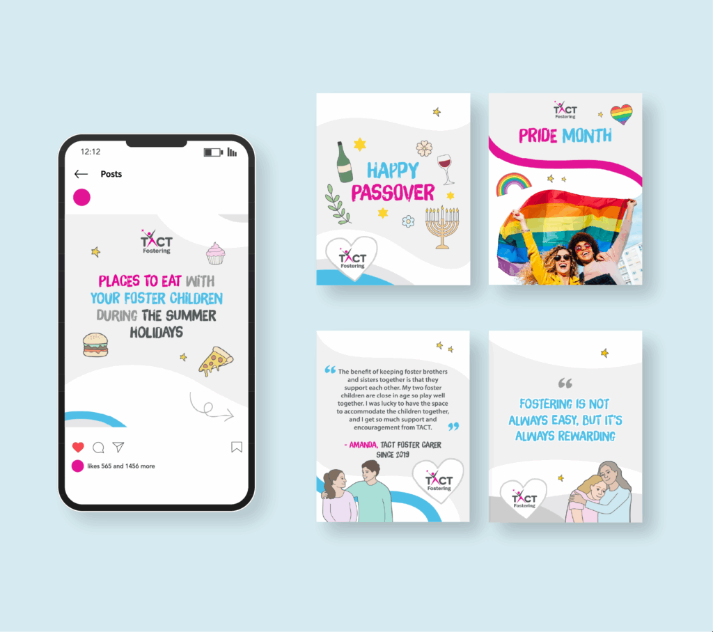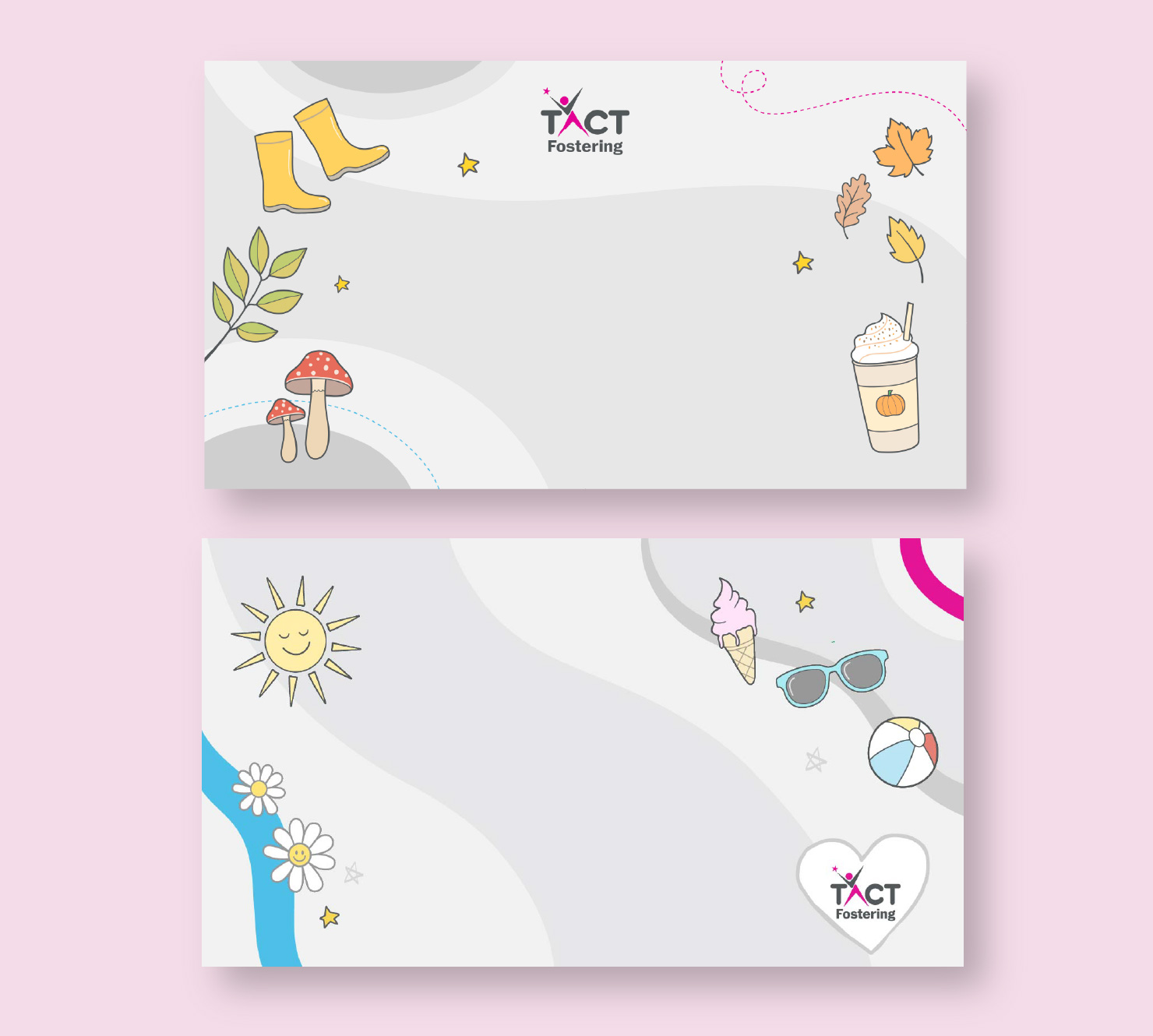 TACT is a not-for-profit fostering charity committed to creating brighter futures for children and young people by providing loving, supportive families for those most in need. I’ve worked with TACT on a range of projects, including brochures, leaflets for information events, social media assets, Teams Backgrounds and marketing campaigns. I also introduced my own illustration style, which has since become a core part of their branding and features prominently across their website and materials. A project I am most proud of is the Children’s fostering guide, the illustrations feature Barney Bear and his journey into foster care, the characters are different animals, showing the diversity in families.
